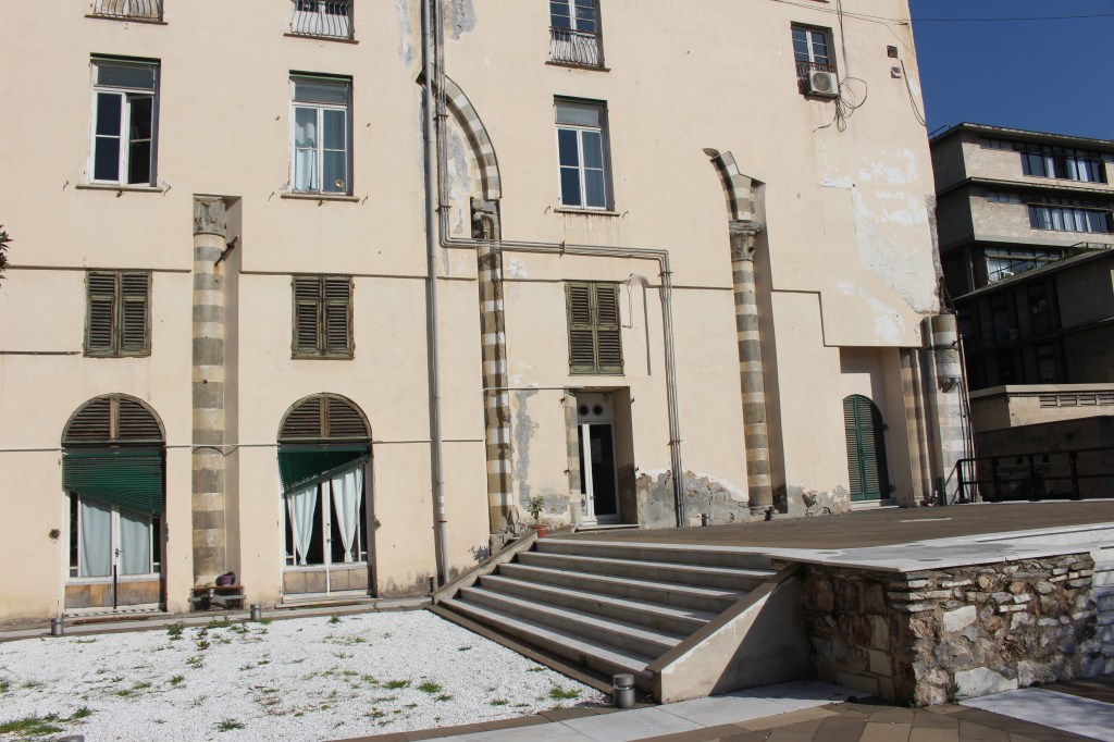 Del convento e della chiesa di San Francesco di Castelletto, edificati nella seconda metà del XIII secolo, in seguito all’avvento delle leggi napoleoniche (1798 ) ed alla successiva demolizione della navata destra, della navata centrale e del transetto, del tempio dedicato al Poverello d ‘Assisi resta ben poca cosa. Lo spazio ricavato venne trasformato in un giardino, un’ angolo di verde che fu usato in primis come museo archeologico all’aperto, atto ad accogliere i resti scultorei di altri edifici medioevali demoliti a seguito della trasformazione urbanistica creatasi con la costruzione delle strade nuove, in un secondo tempo queste testimonianze del passato architettonico antico vennero consegnate al museo di Sant’Agostino. I lavori intrapresi bel biennio 2014- 2015 furono invece impostati a mettere in evidenza quanto restava in sito della chiesa di san Francesco, ad iniziare dalle colonne e dalle arcate che dividevano quella centrale da quella di sinistra ed a recuperare quanto é emerso dagli scavi, una serie di capitelli di fogge ed epoche diverse che mettono in evidenza la stratificazione cronologica di quest’area. Quella scalinata che vedete nella foto e la piazzetta soprastante segnano il punto in cui era posizionato l’altare maggiore. Concludendo una chiesa fantasma, che però fa ancora parlare di se.