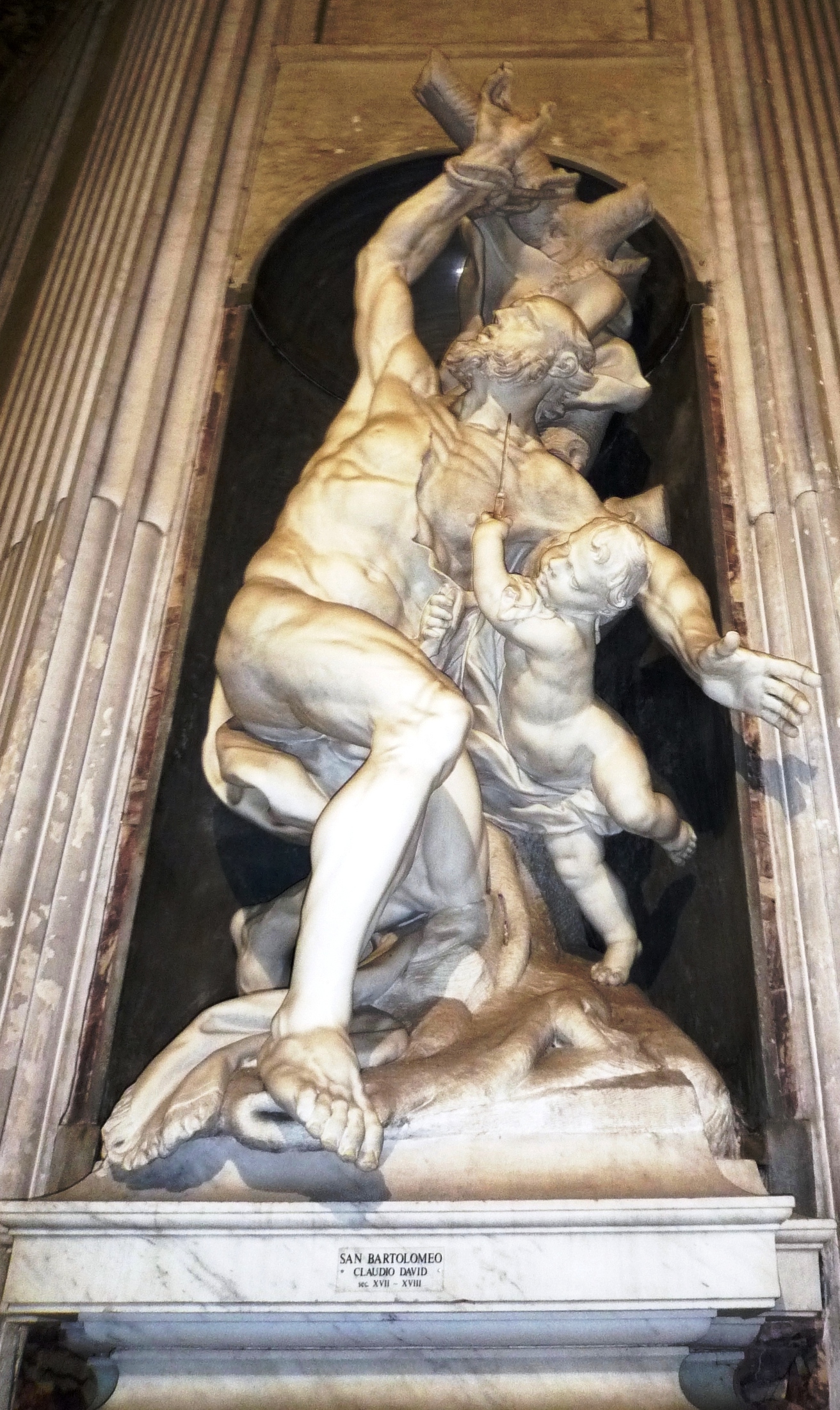 All’ interno della basilica di Santa Maria Assunta di Carignano, sotto la scenografica cupola centrale vi sono quattro nicchioni ospitanti statue colossali, una di queste, scolpita in marmo bianco di Carrara, é un San Bartolomeo dello scultore Claudio David (1678 – 1721 c. ) che lo realizzo nel 1695.