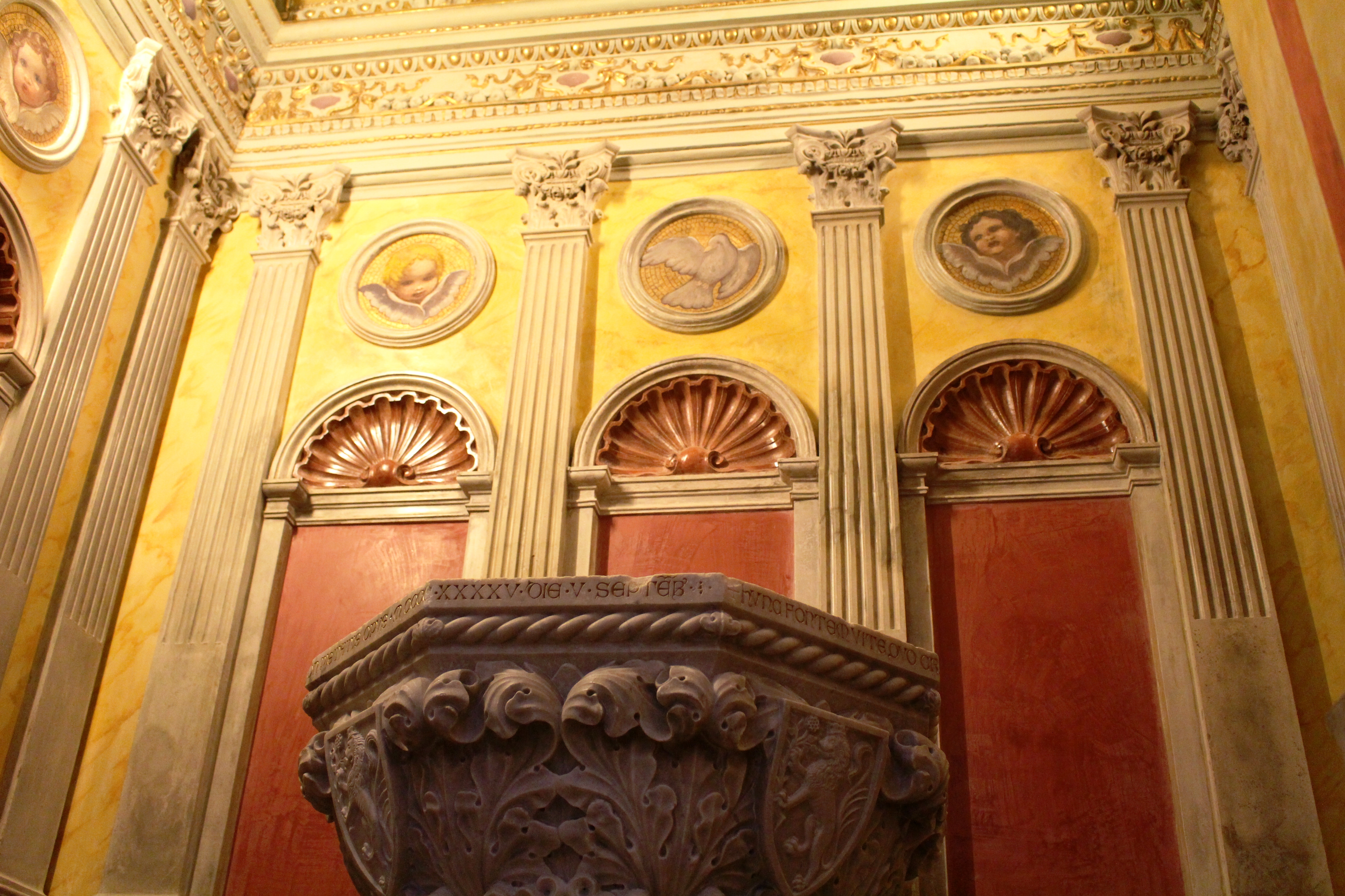 Nell’ antica chiesa dedicata a San Siro primo vescovo di Genova, collocata in uno dei più pittoreschi angoli del centro storico dichiarato patrimonio dell’ Umanità dall’ UNESCO, c’ é una fonte battesimale risalente al 1445, bellissimo per il contesto in cui é stata inserita, una spazio in cui il colore é protagonista assoluto