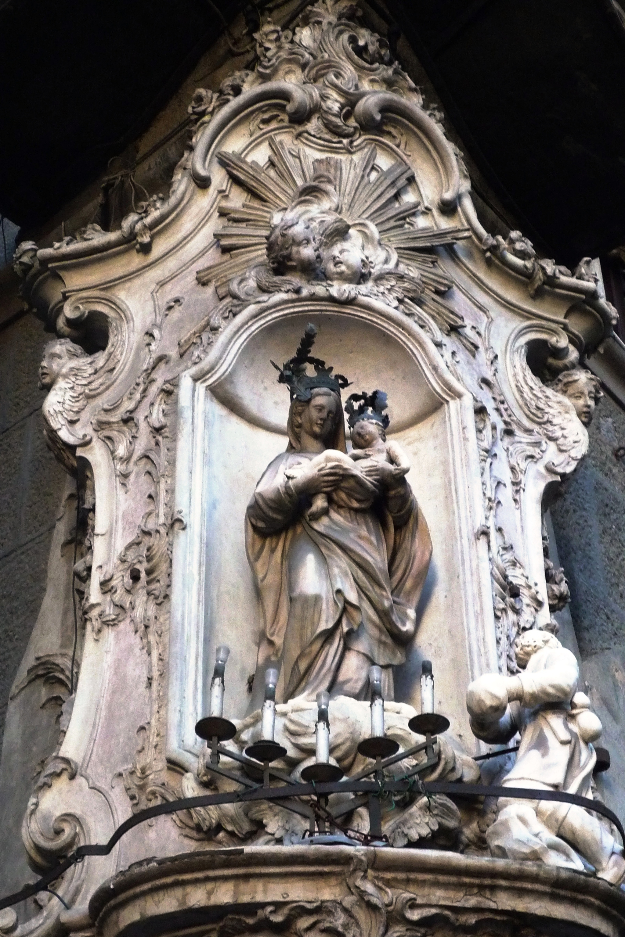 Nel centro storico di Genova sono molto comuni le edicole poste agli angoli dei vicoli ( caruggi ) con le statue della Madonna il cui culto era molto diffuso sin dalle epoche più remote, quella della foto, collocata in via Ponte Reale, raffigura L’ Immacolata con un santo frate, fu realizzata in marmo di Carrara da un ignoto scultore del XVIII secolo.