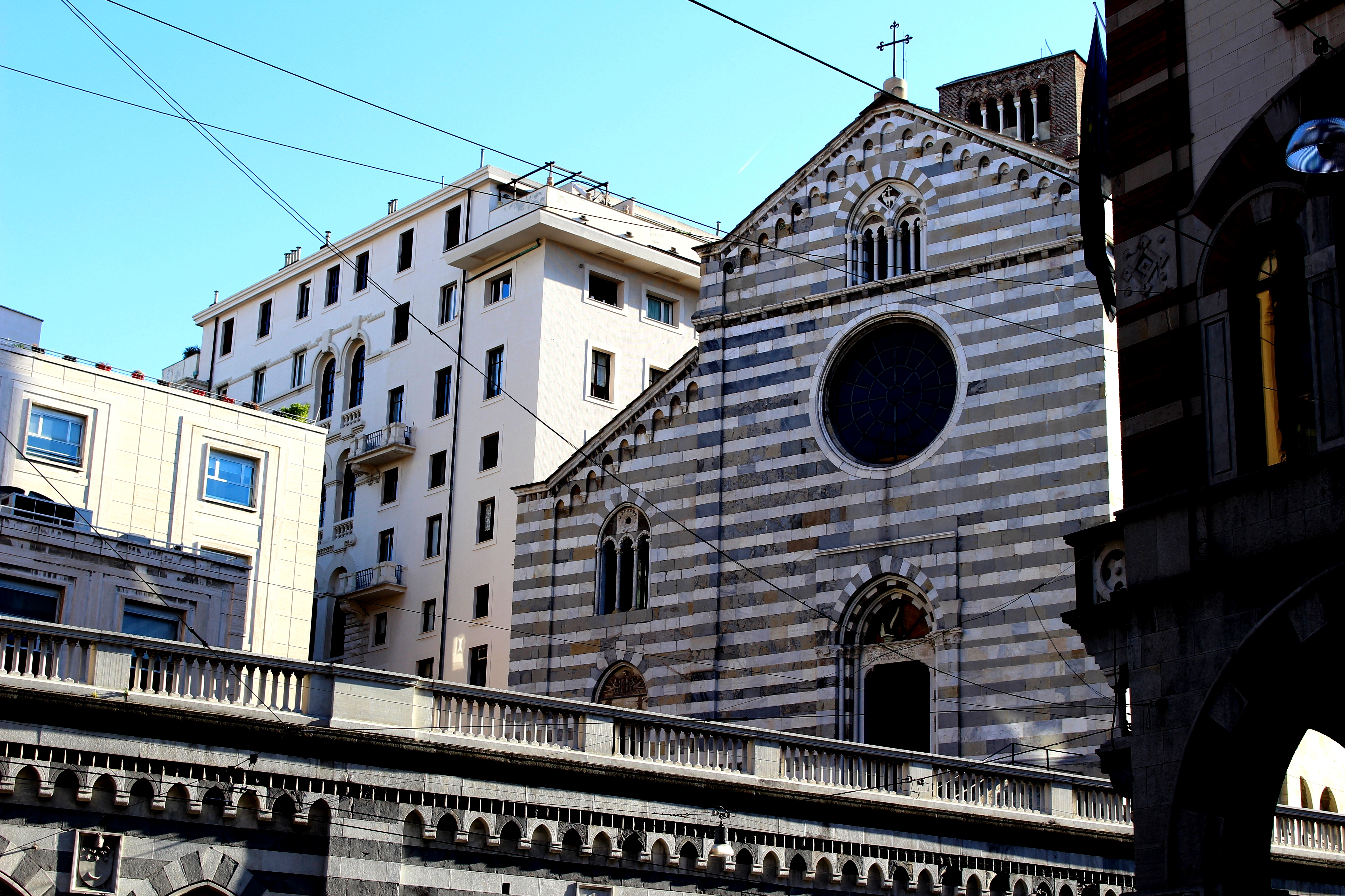 Nel centro storico di Genova, dove si presume fosse il Foro romano, c’ é la chiesa di San Giorgio collocata nella piazza omonima. San Giorgio fu il primo protettore della città, il grido di guerra dei genovesi era: ” Pé Zena e pé San Zorzu “. L’ edificio sacro ha origini molto antiche, le prime notizie risalgono al 947 d.C. Restaurata nella metà del XVII secolo, la facciata assunse un andamento curvilineo ed il suo campanile fu più tardi incorporato entro una casa destinata ad uso abitativo.