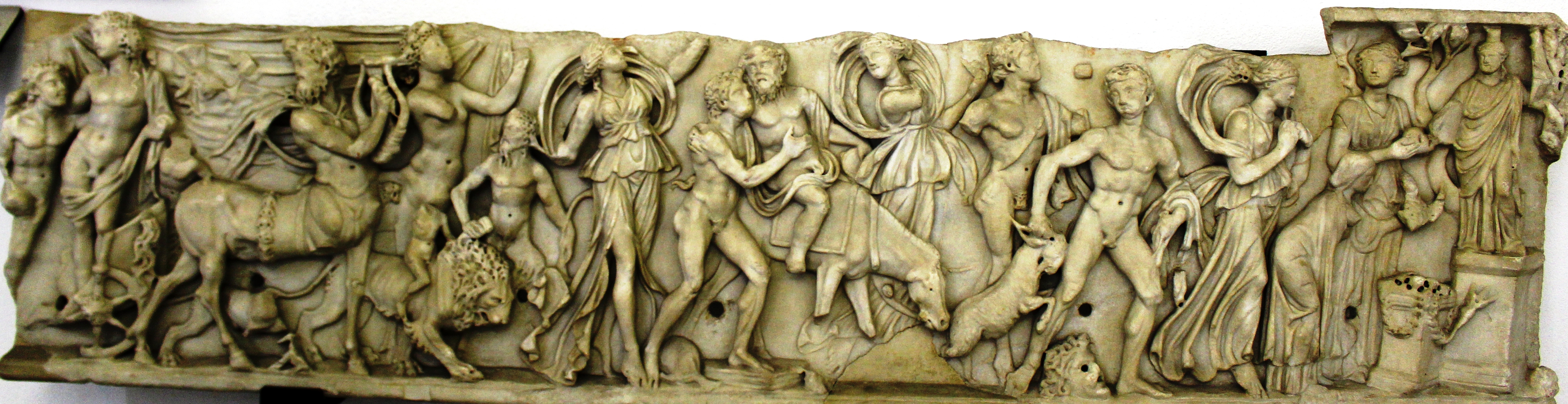 Si tratta d’ una copia romana del II o III secolo d. C. mediata da un esemplare del periodo alessandrino, questo sarcofago rientra quindi nel gruppo di quelli riutilizzati come sepoltura di uomini illustri, un recupero insomma, con funzioni celebrative, e proprio qui sta il problema, la scena scolpita sul fronte del sarcofago rappresenta un THIASOS BACCHICO che, tradotto per i non addetti ai lavori, significa una processione di Sileni,menadi, ninfe e satiri tutti ubriachi fradici che accompagnano in processione il dio Bacco anche egli completamente ebbro, nel bassorilievo il dio é visibile al centro seduto su un asinello e sostenuto da un satiro che lo aiuta a restare in groppa. Credo che Francesco Spinola se lo avesse saputo non sarebbe stato molto contento.