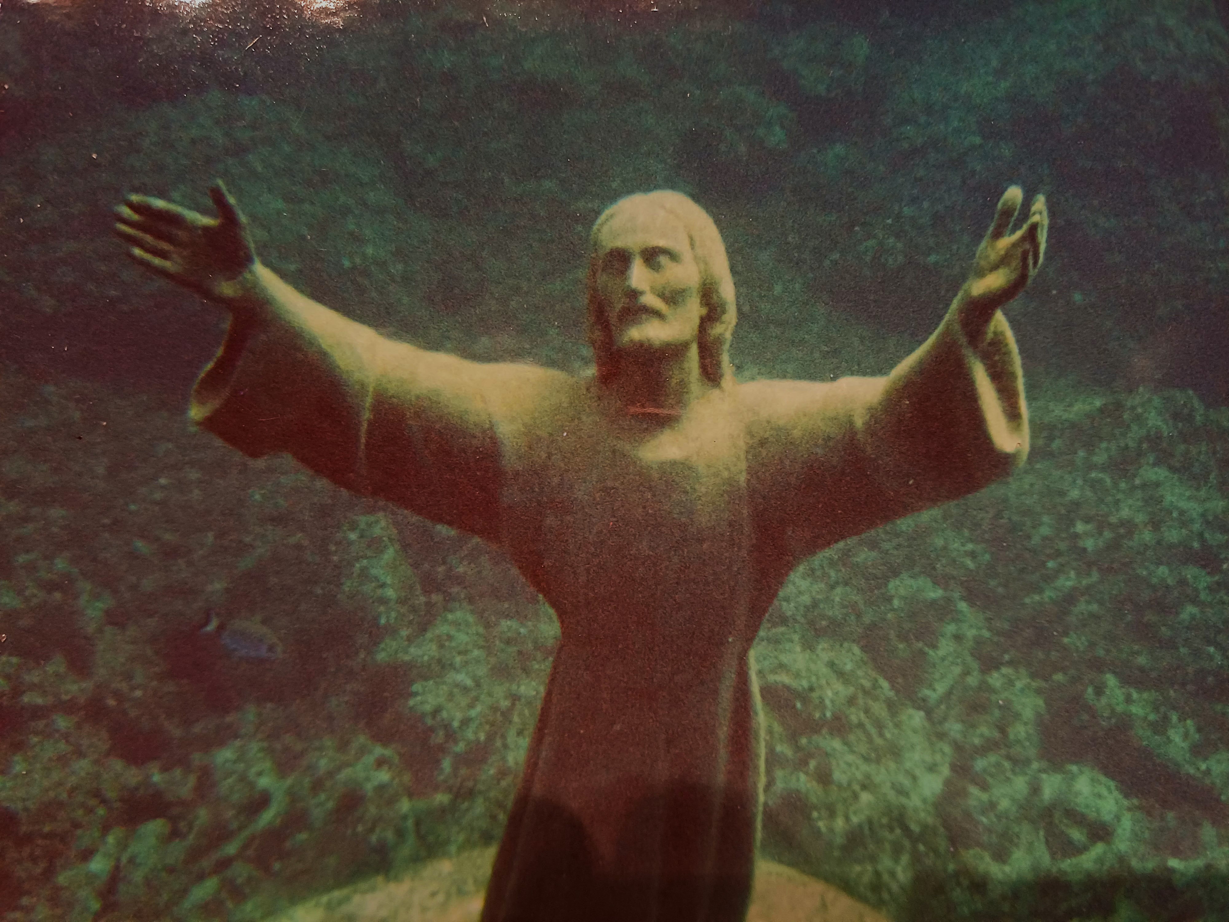 Era un giorno uggioso, di quelli in cui il “Caligo” spegne i colori e tutto il paesaggio assume una tonalità di grigio fumo, il mio umore poi non era migliore, avevo perso l’amore, il lavoro era in una situazione di stagnazione, per usare un eufemismo, dovevo assolutamente staccare la spina almeno per qualche ora, così decisi d’andare a Camogli, presi il vaporetto per San Fruttuoso dove é la splendida abbazia risalente al XII secolo ove i corpi dei Doria riposano in eterno nelle loro arche di pietra., mi sedetti sulla spiaggia a guardare il mare che aveva il colore d’una lastra d’ardesia e già mi sentii un po’ meglio, dopo di che mi misi la maschera e le pinne , entrai in acqua e cominciai a nuotare verso il largo, ad un certo punto lo vidi, era lì sul fondo che mi guardava con le braccia aperte verso di me, essendo una giornata autunnale e infrasettimanale, non c’era in sito il solito via vai di turisti, barche e motoscafi, eravamo soli Lui ed io, presi un grosso respiro e scesi verso il fondo, Gesù sembrava guardarmi, circondato da un’aureola di castagnole, protendendo le sue braccia verso di me quasi a volermi abbracciare, è difficile descrivere l’emozione che provai, è stato bello arrivare alla sua mano e stringerla tra le mie, poi risalii in superficie pinneggiando lentamente. Quando riaffiorai tutti gli affanni e le preoccupazioni che mi affliggevano da giorni non c’erano più, anche il “caligo ” s’era diradato e dalle nuvole un raggio di sole fece capolino ridando i colori a quella splendida spiaggia ed anche alla mia vita.