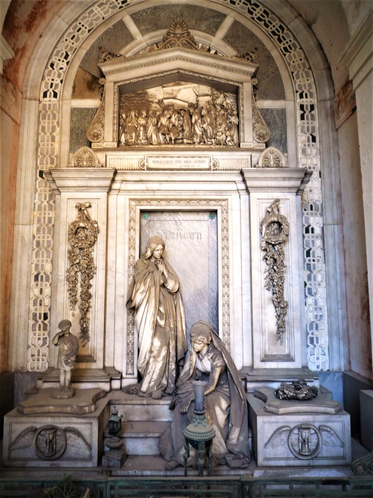 Visitando il Cimitero Monumentale di Staglieno (Genova), nel porticato superiore del settore D ci troviamo di fronte alla tomba della famiglia Gatti realizzata nel1875 dallo scultore genovese Giuseppe Benetti ( 1825- 1914 ).Il Nostro ebbe come maestro Santo Varni alla “Ligustica ” di Genova, nel 1852 completò la sua formazione artistica a Firenze dopodiché ritornò nella sua città natale. Dagli anni ’70 del XIX secolo il suo stile rigidamente accademico, si evolse pian piano verso una maniera più attenta alla resa psicologica dei personaggi rappresentati nelle sue sculture ed anche ad un realismo che potesse far presa sulle emozioni del riguardante. La ricca classe borghese di Genova gli commissionò diverse tombe monumentali, tra le quali quella rappresentata della famiglia Gatti. Sullo sfondo dì un impianto classicheggiante avente una porta al centro della scena che rappresenta il passaggio tra la vita terrena e quella del Cielo, il Nostro introduce naturalezza e realismo alla sua opera raffigurando due figure femminili , una, la vedova sofferente seduta su i gradini di pietra scalza e vestita con abiti moderni e l’altra donna in piedi personificazione del dolore, a lato un bambino piangente, ed in alto un bassorilievo con l’episodio evangelico della vedova di Naim. In questo gruppo scultoreo il Benetti ci mostra come il suo stile classico, come detto, andasse verso uno stile emozionale ed ad un immaginario simbolico alle volte anche religioso.