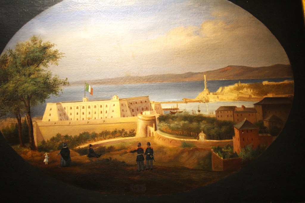Dipinto del pittore Domenico Cambiaso ( Genova 1811 – 1894 ) ” Il Castelletto ” nel 1848, un anno prima che venisse distrutto dai genovesi in rivolta. Opera conservata nel Museo del Risorgimento già Casa di Giuseppe Mazzini in Via Lomellini di Genova