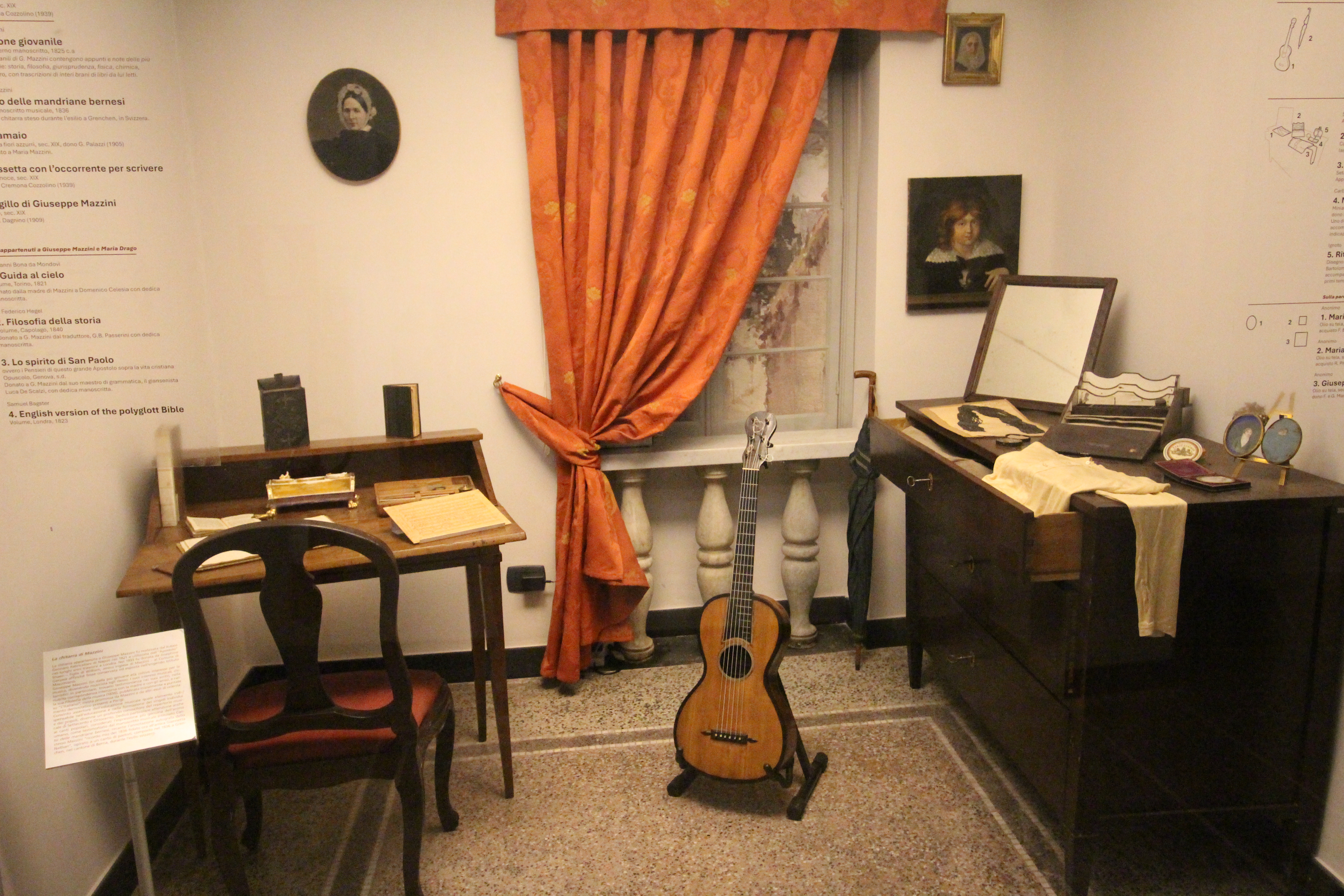 Passeggiando in via Lomellini, dopo lo splendido oratorio rococò del tempio dedicato a San Filippo Neri, lì vicino vi troverete di fronte ad un portone che é l’ingresso del Museo dedicato al Risorgimento italiano, in realtà originariamente quella fu la casa dove nacque e crebbe Giuseppe Mazzini ( Genova 1805 – Pisa 1872), grande pensatore, rivoluzionario, patriota e pluriricercato non solo dalla polizia austriaca ma anche da quella sabauda che non so cosa avrebbe dato per poterlo ammazzare. Quest’uomo, al quale l’ Italia deve così tanto, nacque in questa casa da una famiglia non nobile ed è ancora visibile la sua stanza studio dove fa bella mostra di se una chitarra…. si perché Mazzini amava questo strumento e lo suonava per suo diletto ed anche per quello dei suoi amici e sostenitori; della serie : non solo di politica vive l’uomo ma anche di musica e convivialità.