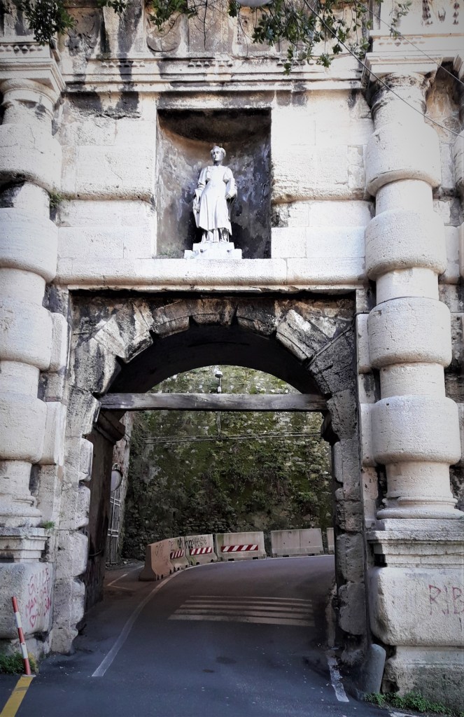 ….A pochi passi ammirasi la grande e maestosa porta della città, detta di Sato Stefano dell’Arco, architettata d’ordine dorico in travertino da Taddeo Carlone (*), con sopra la statua in marmo del santo protomartire del medesimo autore. E’ qui il principio del colle di Carignano che, col mezzo appunto d’un ponte a tre archi elevatissimo sopra la porta anzidetta situato, col colle attiguo di Santo Stefano ammirevolmente congiungesi… Così descriveva la Porta degli Archi un anonimo viaggiatore del 1818. la Porta costruita nel 1536, faceva parte della sesta cinta muraria eretta nel XVI secolo, la Porta degli Archi detta anche di Santo Stefano era originariamente collocata dove ora sorge il maestoso Ponte Monumentale ed univa la via Giulia con la via della Consolazione ora sostituite dalla bella via XX Settembre, una volta bellissima con le sue boutique, i suoi teatri ed i suoi cinema, ben cinque, che oggi non ci sono più. La porta da dov’era venne smontata e ricostruita in cima a via Banderali nel 1896 e lì la vidi io per la prima volta scendendo da Carignano con destinazione gli stabilimenti balneari San Giuliano di Corso Italia, avevo circa 6 anni , mia madre mi teneva per mano perché aveva paura delle auto, per la verità a quel tempo non molto numerose, che percorrevano quella stretta via, restai a bocca aperta guardando quel varco maestoso sormontato da una statua d’un uomo che mi parve piccino, così incuriosito chiesi a mia madre se quello gnomo fosse il guardiano della Porta e lei sorridendo mi rispose che non si trattava d’uno gnomo ma d’un santo.